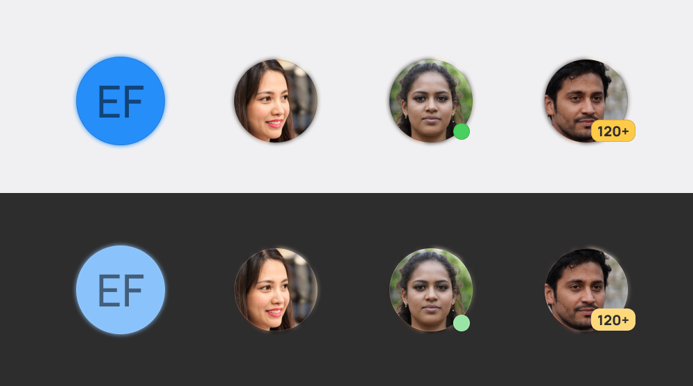 Avatars are images that identify a person's picture throughout the user interface. It is used when identification of people is necessary, for example in chat apps. One may badge the Avatar with: Modifier Badges (with text e.g. number of messages), Classifier Badges.